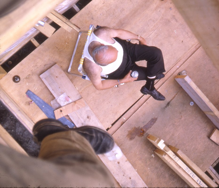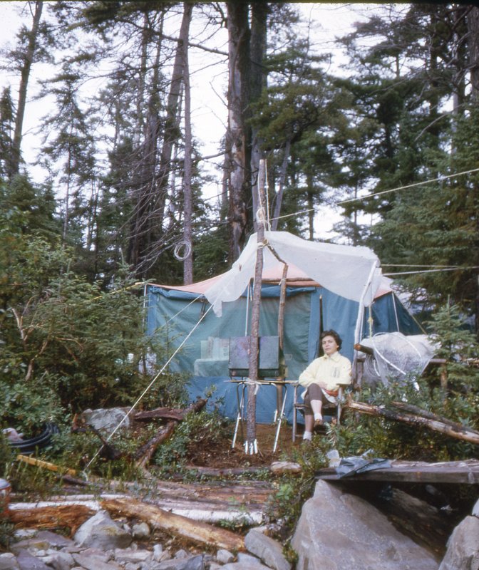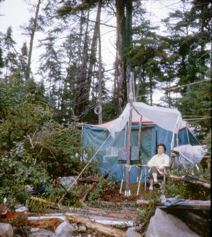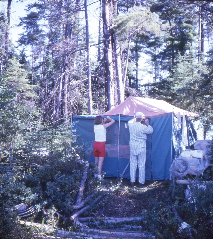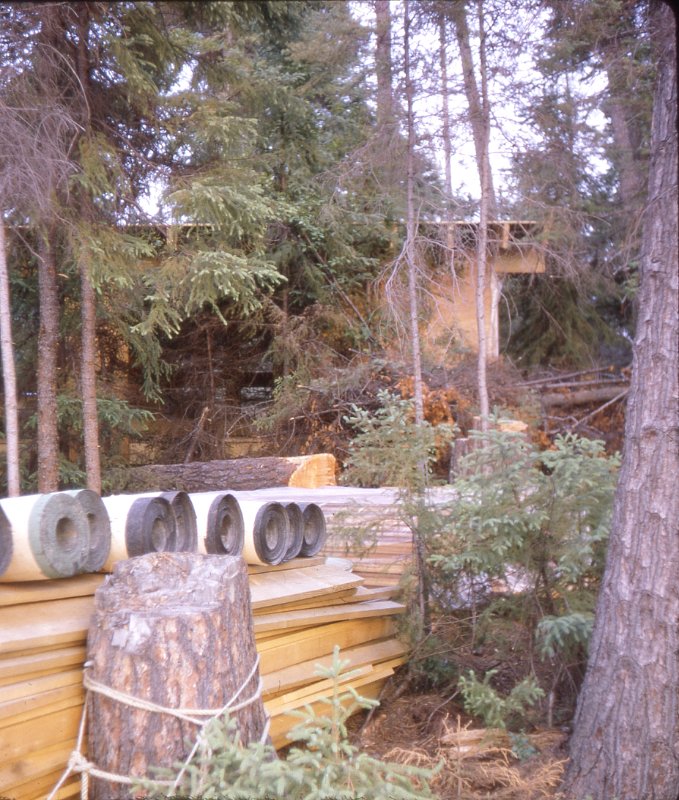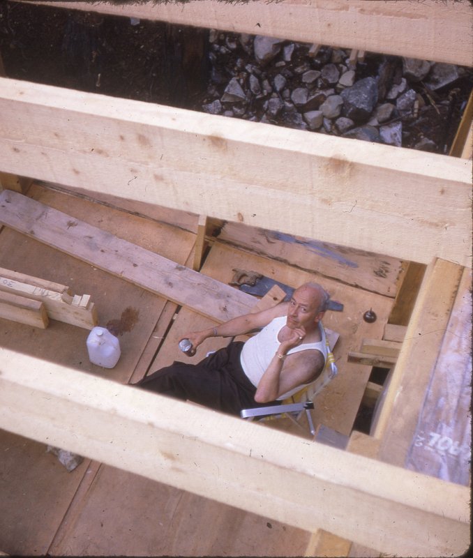 Sunbathing 1967Morning summer 1967Tent maintenance 1967Morning summer 1967Tent maintenance 1967Chef rests between meals - summer 1967Chef rests between meals - summer 1967Structure takes shape sumer 1967Construction lumber all rough-sawn unplanedConstruction foreman summer 1967Posts, girders and joistsHigh level workwood for next year's work - cladding,flooring, interior wallsSummer 1967