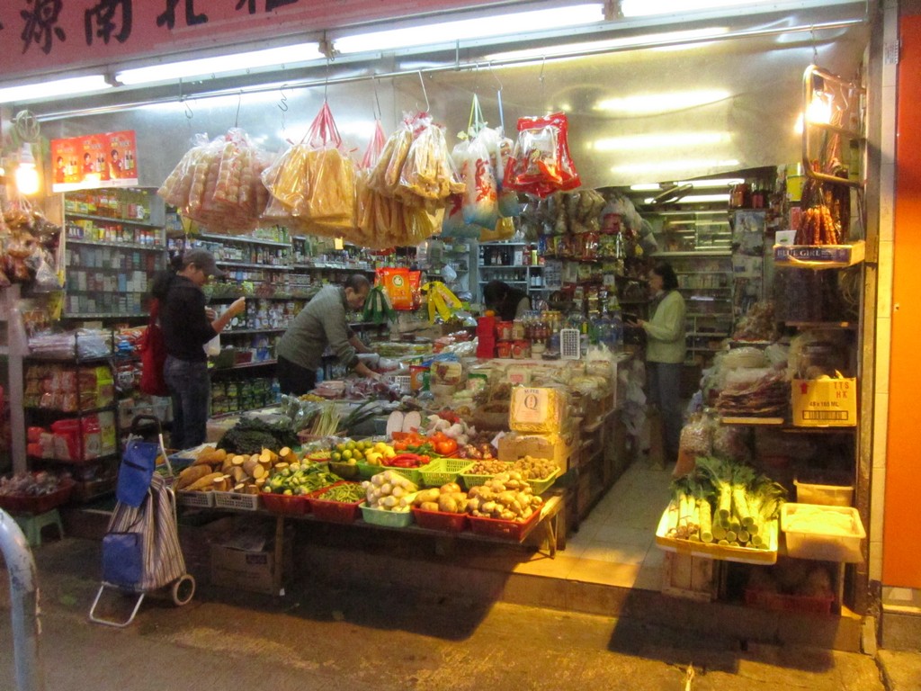 HK - Christmas 2012 - Typical Open front food shop. Kori buying a Phone Card