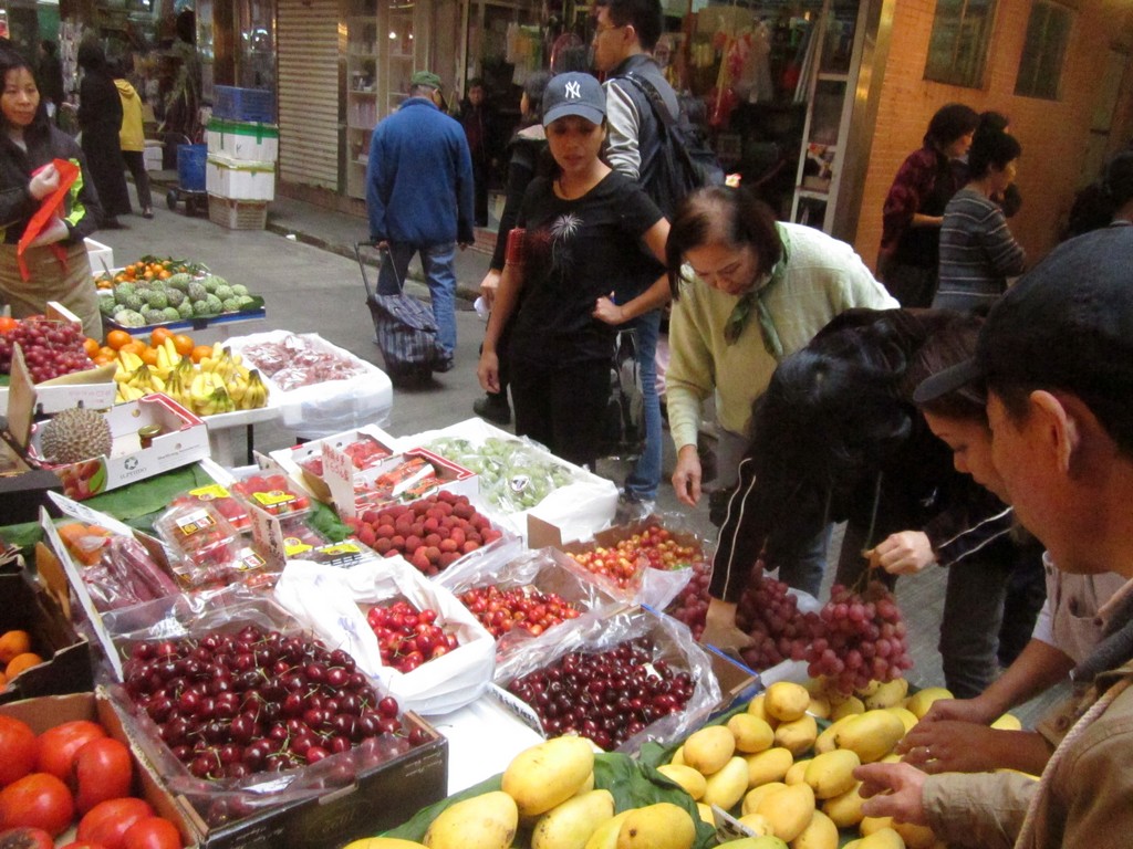 HK - Christmas 2012 - Street market. Kori buying fruit.