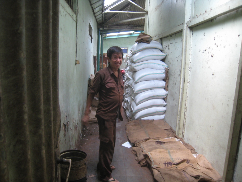 Vidyapratama, the owner and son of the founder in a link from the sunning yard to the main room.
